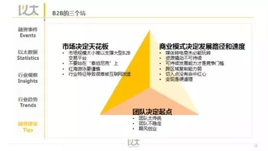以太投資團(tuán)隊(duì)曾經(jīng)從3個(gè)維度,對B2B平臺通常面臨的問題(也就是常見的“坑”)做了總結(jié),分別是市場/方向、團(tuán)隊(duì)和商業(yè)模式。他們認(rèn)為,B2B所在的市場決定了發(fā)展的天花板,團(tuán)隊(duì)決定了起點(diǎn),而商業(yè)模式?jīng)Q定了平臺發(fā)展的路徑和速度。這也是B2B平臺在尋求投資的過程中,最為投資人所看重的三個(gè)方面。