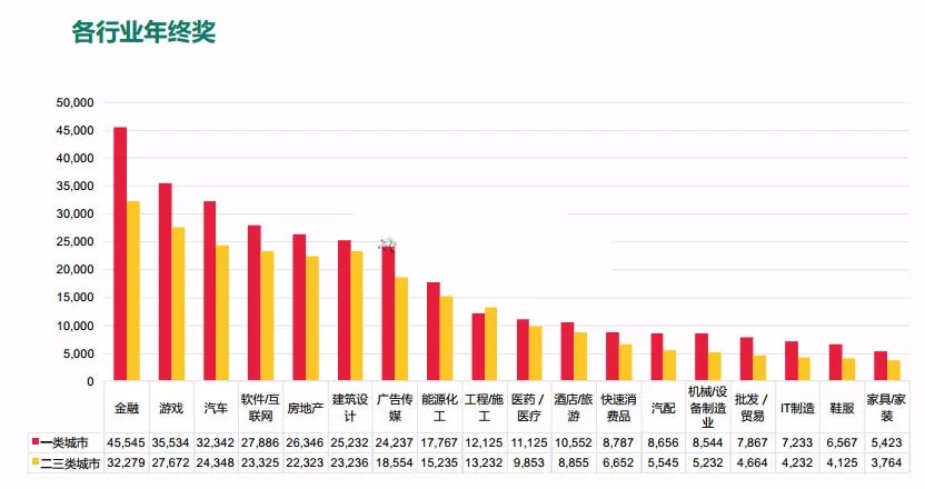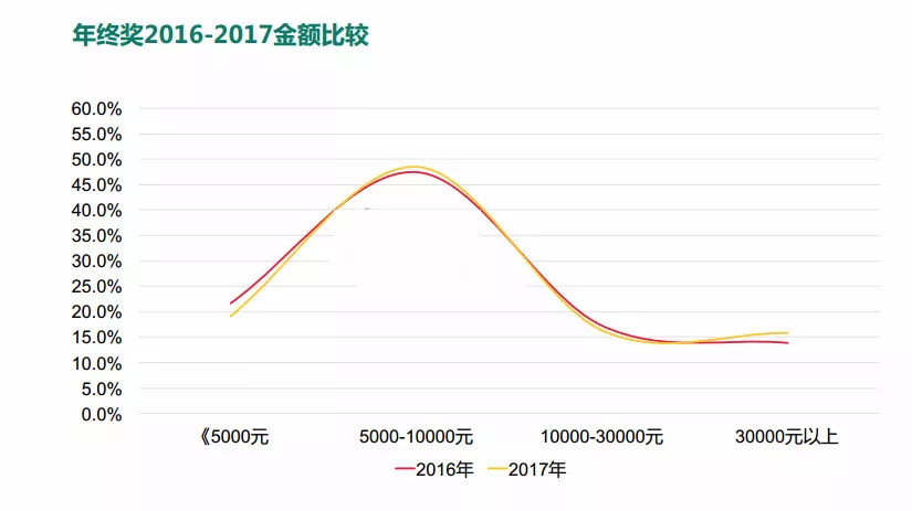 根據2016-2017年年終獎調研報告顯示,近半數企業人均年終獎在5001—10000元的額度,19%的企業人均年終獎少于5000元,超17%的企業人均年終獎10001-30000元,當然同樣有15%的任性企業人均年終獎額度超過3萬元。按行業分類,金融、游戲、汽車行業年終獎額度最高,鞋服、家具家裝行業年終獎額度最少。