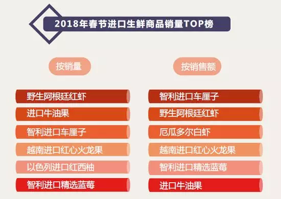 2018年春節(jié)期間,按照銷售額排序,最受歡迎的進口生鮮商品為:智利進口車厘子、野生阿根廷紅蝦、厄瓜多爾白蝦、越南進口紅心火龍果和智利進口精選藍莓。
