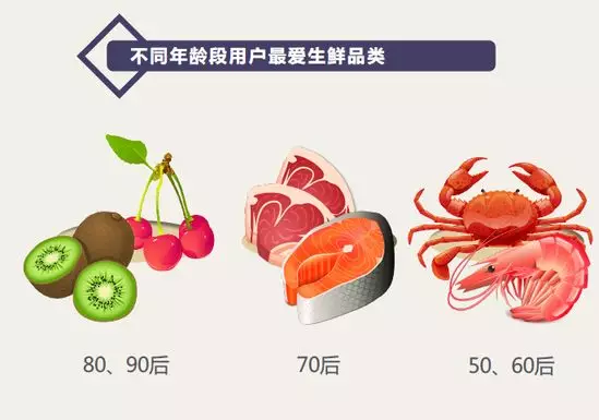 京東大數據發(fā)現,80后、90后愛買水果,奇異果/獼猴桃、車厘子是他們的最愛;70后偏愛買豬牛羊雞肉和蛋類;50后和60后愛買海鮮水產,其中以魚類和蝦類居多。
