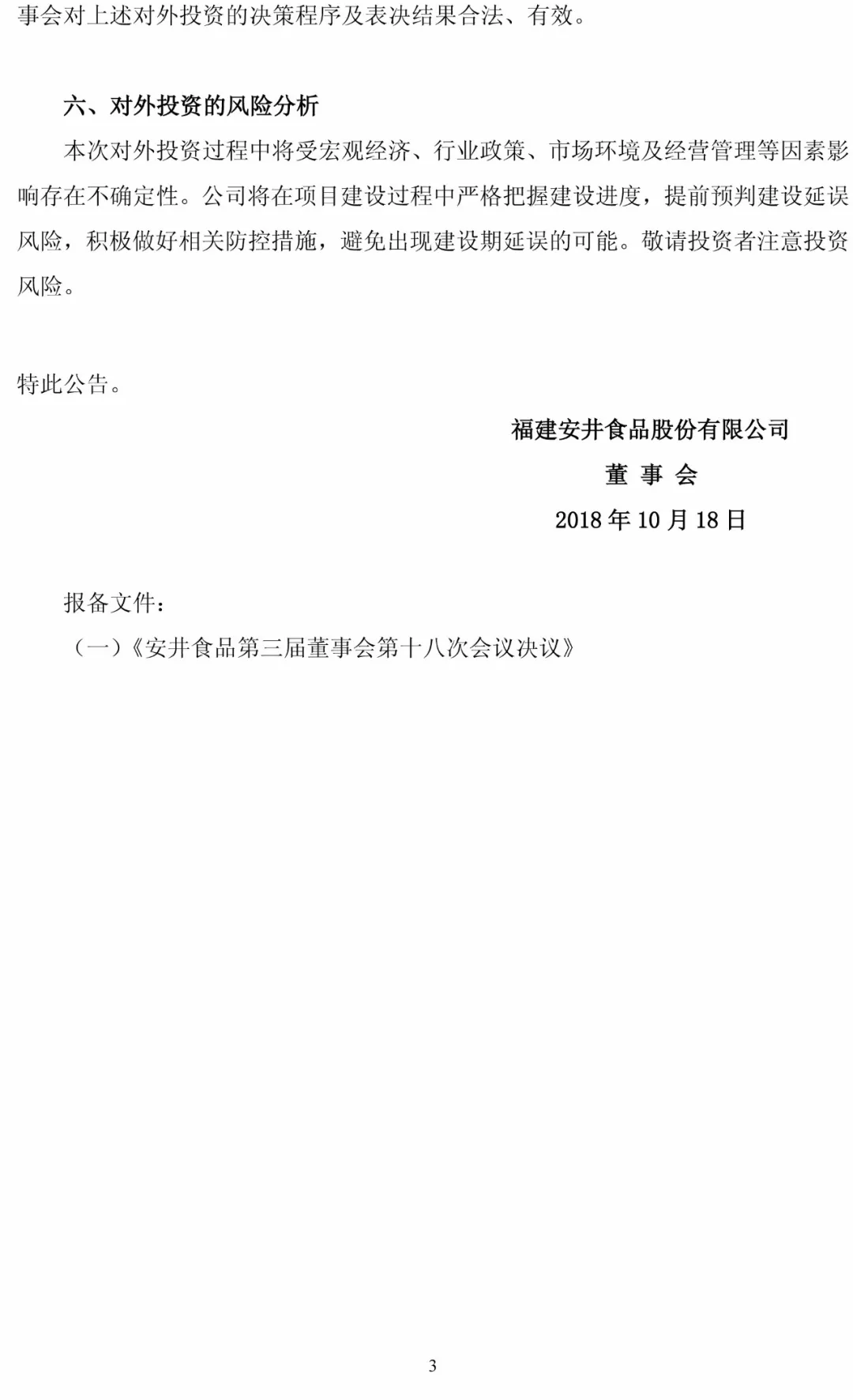 10月17日,安井食品召開第三屆董事會(huì)第十八次會(huì)議,審議通過了《關(guān)于公司對(duì)外投資建設(shè)華北生產(chǎn)基地項(xiàng)目的議案》,同意公司以3億元人民幣投資該項(xiàng)目。同日,公司與湯陰縣人民政府簽署《安井食品華北基地項(xiàng)目投資合同》。